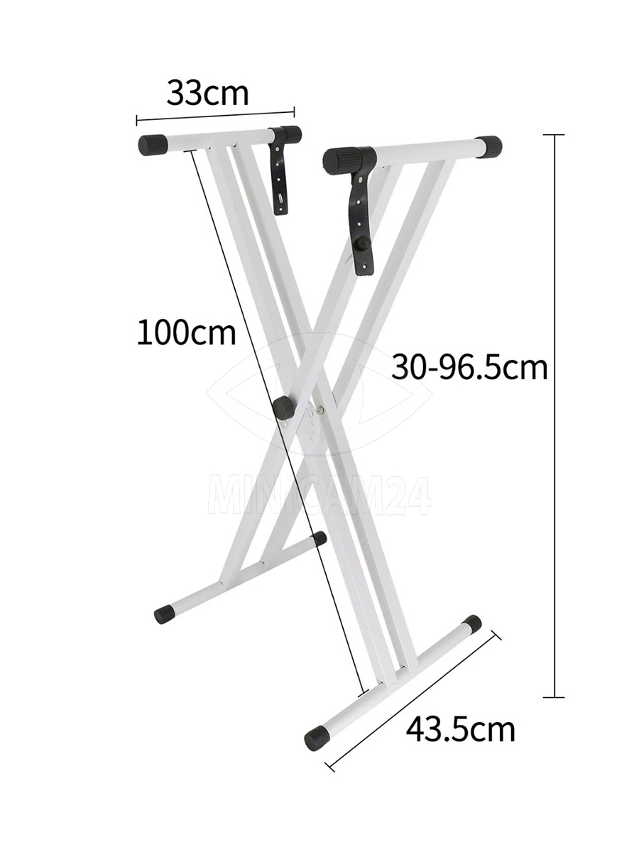 Каркас выполнен из железа с квадратными трубами сечением 2,5 × 2,5 см. Такая конструкция выдерживает нагрузку до 20 кг, что достаточно для большинства стандартных моделей клавишных инструментов. Противоскользящие резиновые заглушки на ножках предотвращают смещение стойки и защищают поверхность пола от повреждений.